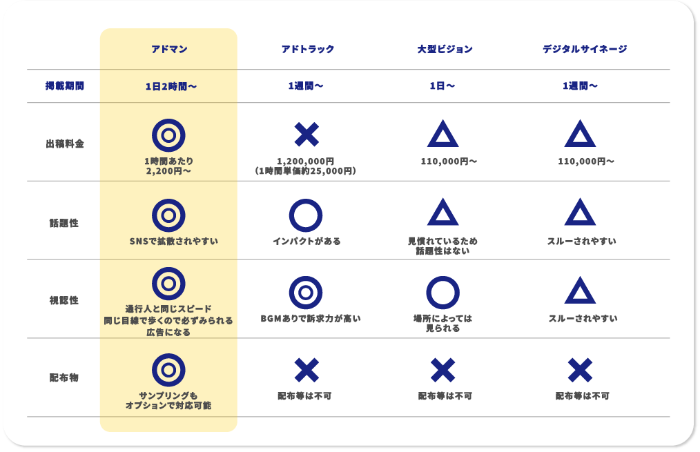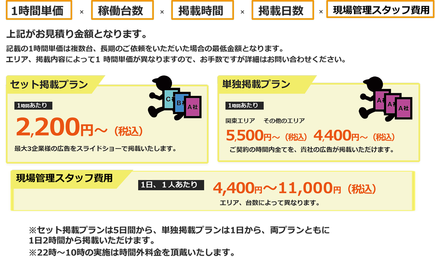 1日3時間のご依頼が一番多いです。夕方〜夜にかけての暗い時間のほうが視認性が高くなりますので推奨しております。